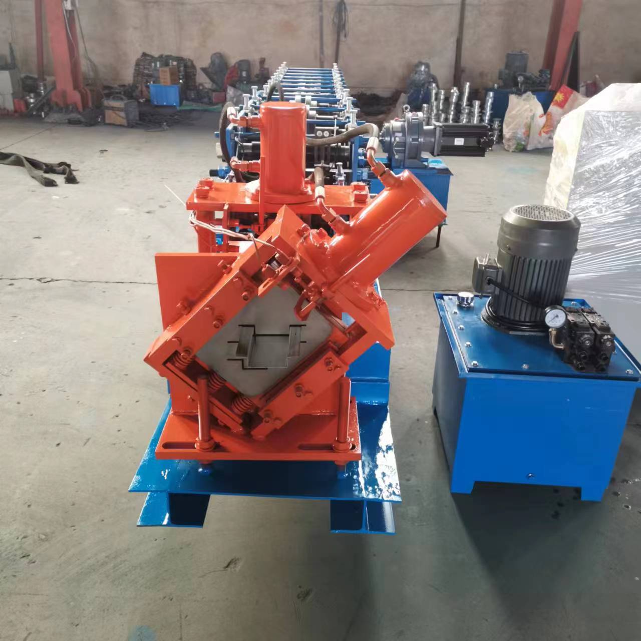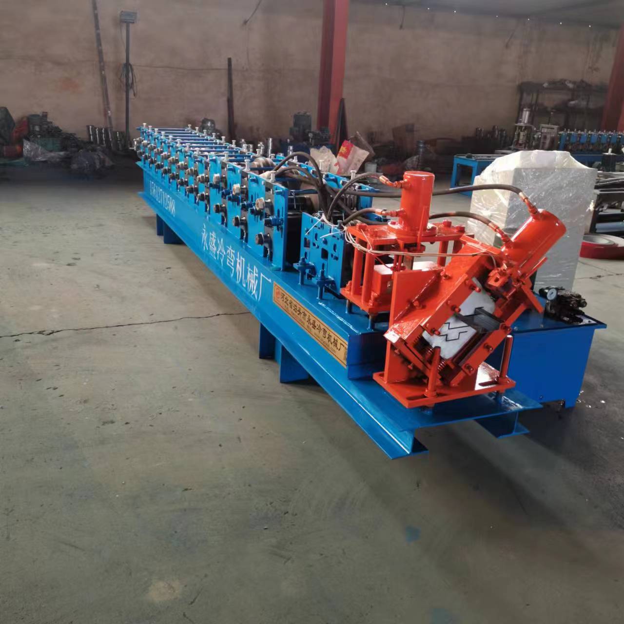 几字u型冲孔切断一体机主要由放料架、进料导入平台、校平装置、成型主机、液压切断、液压站、冲孔部分,电脑控制柜等几部分组成。